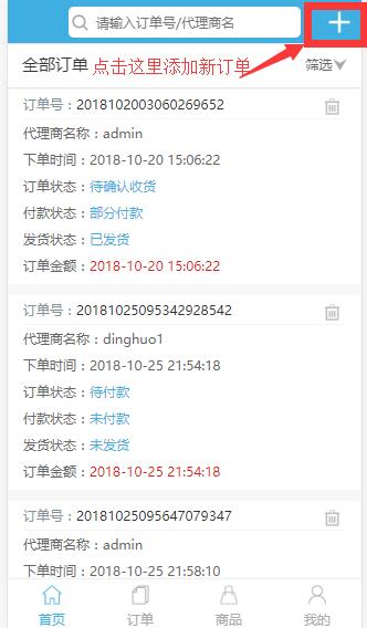 通过手机登录订单宝,点击下方的订单列表页面 弹出订单列表页面 点击页面右上角的+号即可进入手机版后天的新建订单页面。