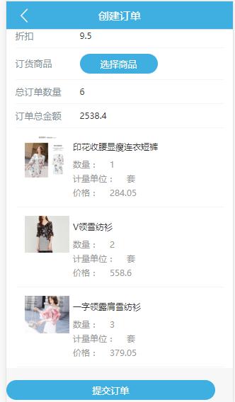 选择用户后选择商品点击选择商品按钮 弹出商品列表页面,在商品列表中 输入要购买的订货数量 然后点击完成即可 如图