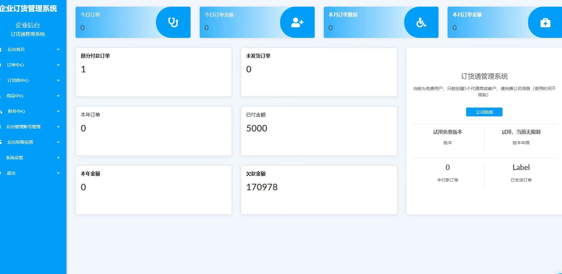 订单中心用于管理整个企业的订单和新建订单。包含(新建订单、订单列表、未发货订单、已发货订单、未付款订单、部分付款订单、全额付款订单、查看订单详情、查看订单付款信息等。)