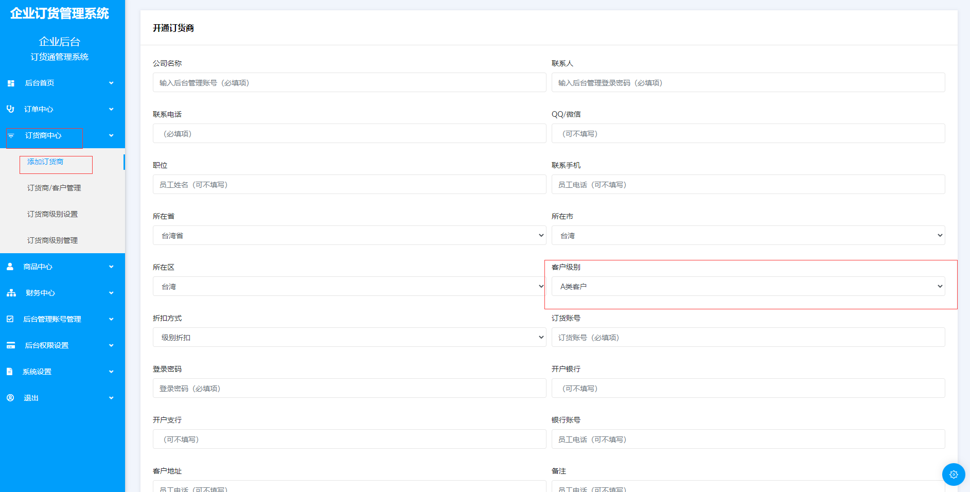 步骤2:建立订货用户,并且选择相应用户级别