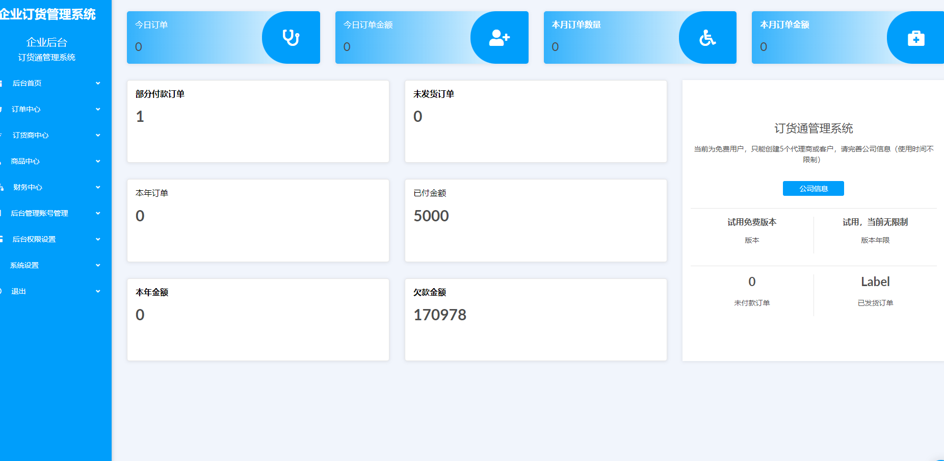 订单中心用于管理整个企业的订单和新建订单。包含(新建订单、订单列表、未发货订单、已发货订单、未付款订单、部分付款订单、全额付款订单、查看订单详情、查看订单付款信息等。)
