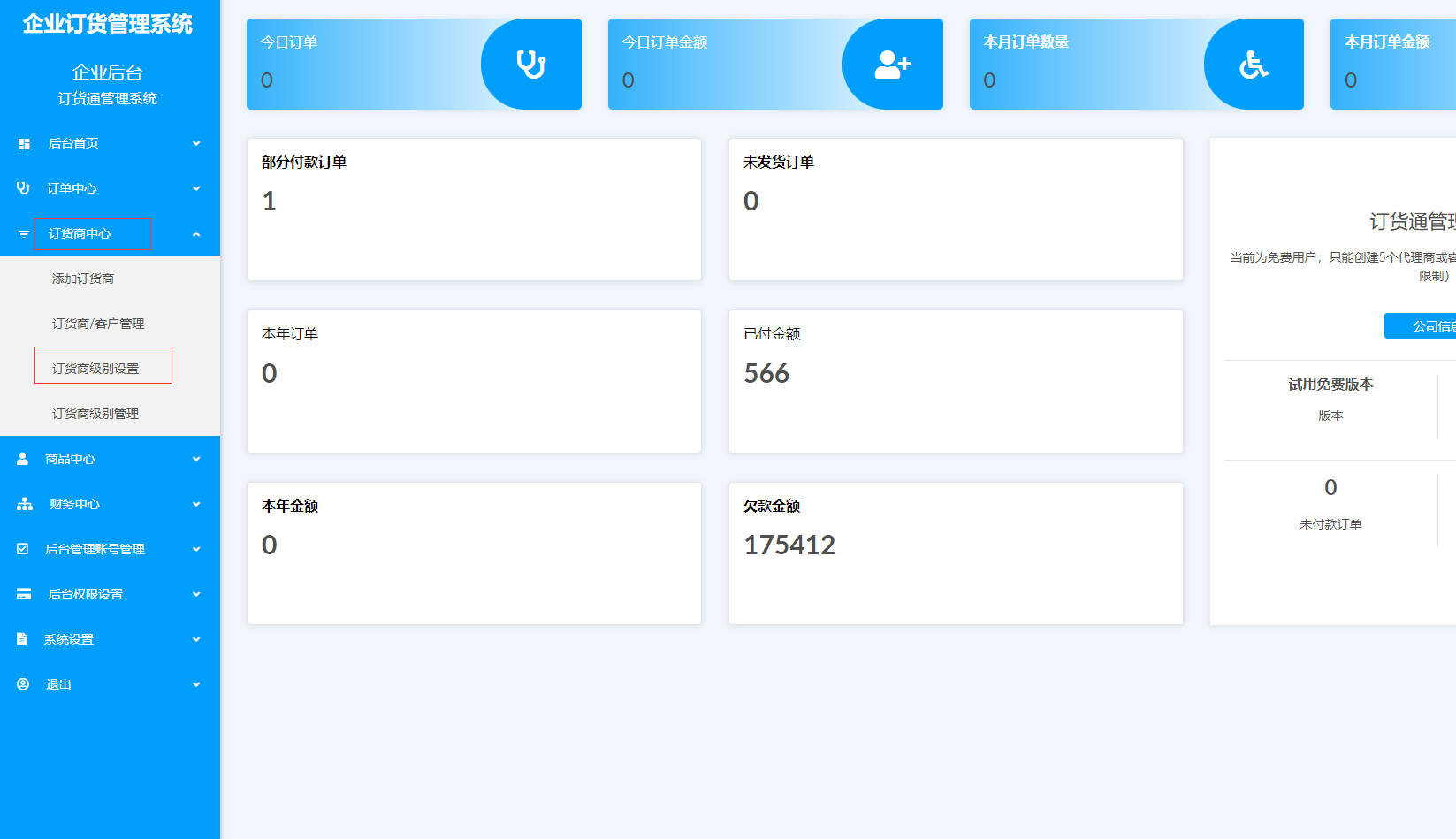 进入订货系统后台后点击左边菜单 1:订货商中心 2:点击子菜单中的订货商级别设置