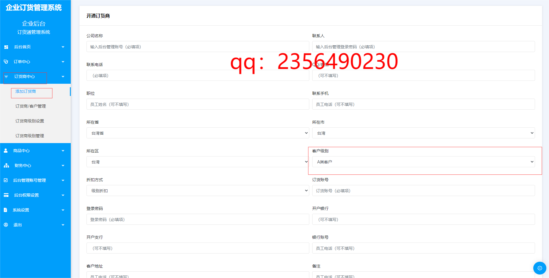 订货商中心用于管理企业的订货商、代理商、客户。设置用户的级别和级别折扣
